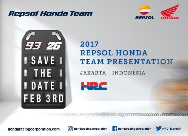 Awal tahun 2017 sudah kita jalani dengan berbagai aktifitas, tak ketinggalan beberapa kegiatan juga akan dimulai, salah satunya Motogp musim 2017 juga akan segera dimulai, tapi sebelumnya seperti biasa para pembalap akan melakukan launching team baru dengan pembalap baru mereka juga motor prototipe yang akan mereka pakai saat balapan satu musim penuh. Dan dari info yang beredar jika team Repsol Honda secara ekslusif akan melakukan perilisan team Repsol Honda Motogp 2017 di Indonesia. Info tersebut pun per hari ini sudah dikonfirmasikan langsung oleh pihak HRC Honda juga Team Repsol langsung via media sosial.