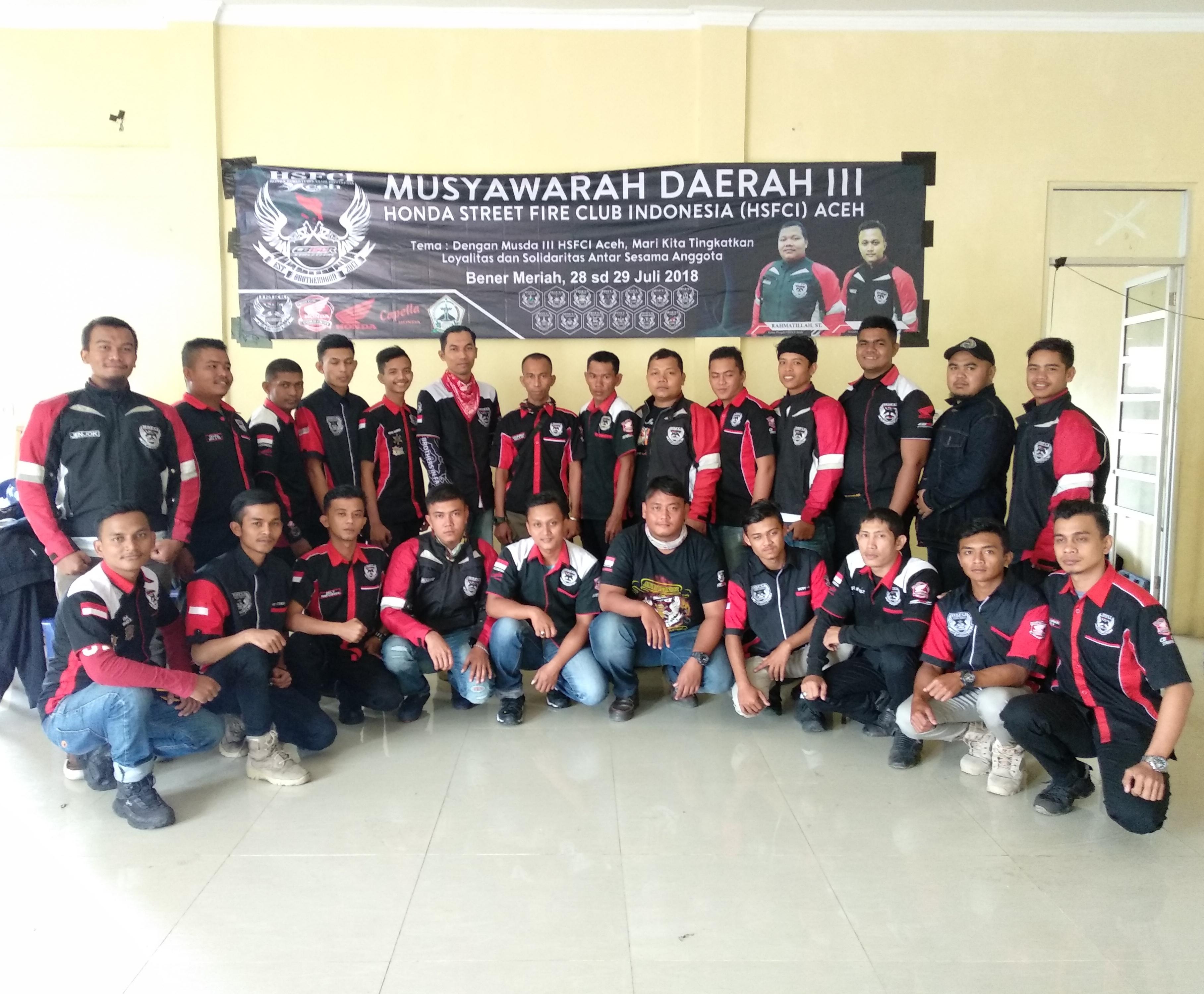 Sebanyak 30 Bikers Honda Street Fire Club Indonesia Wilayah Aceh yang biasa disebut HSFCI Aceh menghadiri Musyawarah Daerah ke-3 yang berlangsung di Aula Pramuka Pante Raya, Bener Meriah. Para pecinta Honda CB150R Street Fire ini bersilaturrahim sembari mempererat solidaritas, persatuan dan kesatuan antara sesama member HSFCI Aceh. Mengusung tema "Dengan Musda III HSFCI Aceh, Mari Kita Tingkatkan Loyalitas dan Solidaritas Antar Sesama Anggota," Musyawarah Daerah ke-3 ini digelar oleh Honda Street Fire Club Indonesia (HSFCI) Aceh dengan dukungan penuh dari Kepramukaan dan Kepolisian wilayah Kab. Bener Meriah.