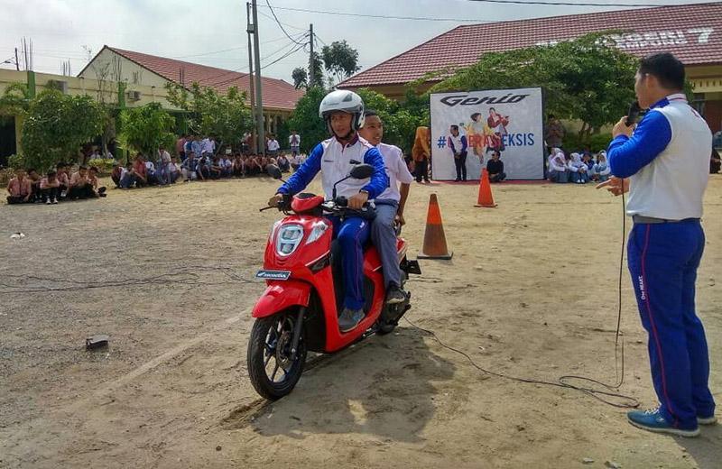 Kemudian kegiatan dilanjutkan dengan praktik berkendara dilapangan menggunakan sepeda motor terbaru Honda Genio yang dijamin keamanan dan kenyamanannya. Para instruktur juga tak lupa mengadakan challenge kepada peserta dengan hadiah - hadiah special khusus para peserta yang berhasil menyelesaikan tantangan praktik berkendara.