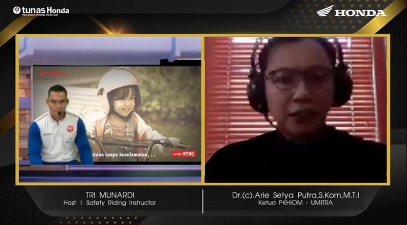 Pada sesi pertama materi Seminar Safety Riding Webinar diisi oleh Instruktur safety riding Tunas Honda Lampung yaitu Tri Munardi selaku Safety Riding Officer. Tri Munardi juga menyebutkan terkait pentingnya berkendara dengan aman, perlunya penggunaan riding gear yang benar, posisi berkendara yang baik dan tips-tips dalam menghadapi pola-pola berbahaya di jalan raya seperti menghindari daerah blank spot dari kendaraan roda empat.
